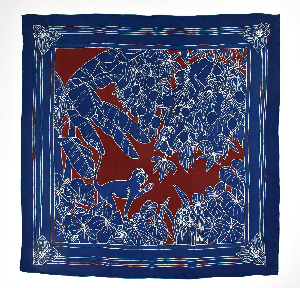 Our silk foulards are individually produced, taking 10 days to complete. The design is hand drawn with wax, in the traditional batik tulis style, by Balinese artisans and hand painted. The artwork is then dried under the sun, resulting in a double side textile with vibrant colors that do not fade. Every piece is unique with slight variations that are characteristic of their artisanal quality.